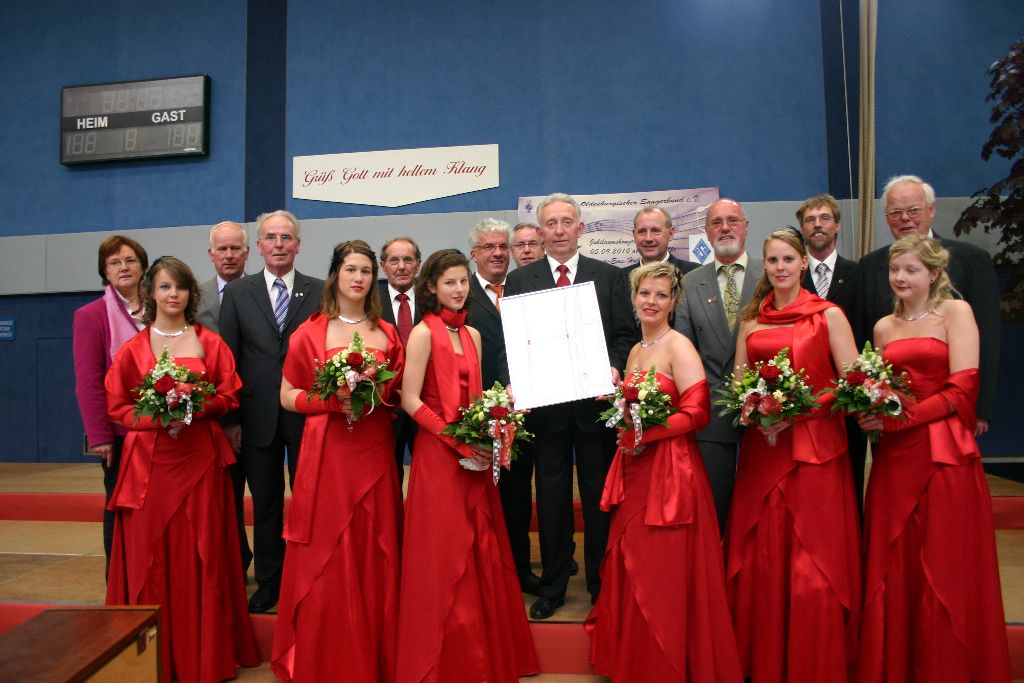 Am darauffolgenden Sonntag trafen sich die Gäste und Delegierten des Sängerbundes „Heimattreu“ im Festzelt. Im Anschluss an den Gottesdienst traten bei schönem Wetter alle 26 teilnehmenden Chöre und Musikvereine zum gemeinsamen Umzug durch den Ort an. Ein besonderes Highlight stellte der festlich geschmückte Wagen mit den bezaubernden Lyra-Damen dar. Nach dem anschließenden Chorsingen im Festzelt erfolgte der Sängerkommers, an dem sich an die 1000 Sängerinnen und Sänger beteiligten. Bei Gesang und Tanz herrschte eine ausgelassene Stimmung. Einigen Mitgliedern unseres Chores wurden Ehrungen zuteil: Für ihre 50-jährige Mitgliedschaft wurden H. Schmit und A. Schrandt ausgezeichnet. F. Möslein erhielt für seine 40-jährige Vereinstreue eine Ehrung.