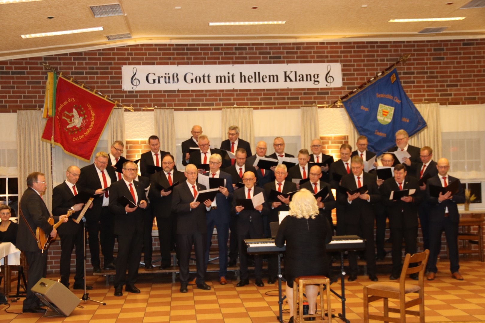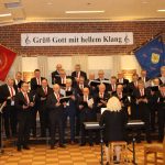 Der Männergesangverein unter Leitung von Tatjana Meyer begrüßte seine Gäste mit „Grüß Gott mit hellem Klang“, „Wo die Weser rauscht“ und „Uralte Eichen“. Daran schlossen sich die Lieder „Freunde lasst uns singen „von Otto Groll; das Lied „Sweet Caroline von Neil Diamand; das Stimmungslied „ Tage wie diese“ von den Toten Hosen und das Lied der „Hochzeit der Frösche“ von Alfons Burkhardt an. Erst nach einer Zugabe durften die Männer die Bühne verlassen. Unterstützt wurde der MGV bei seine Vorträgen von Günther Bischof auf der Gitarre.